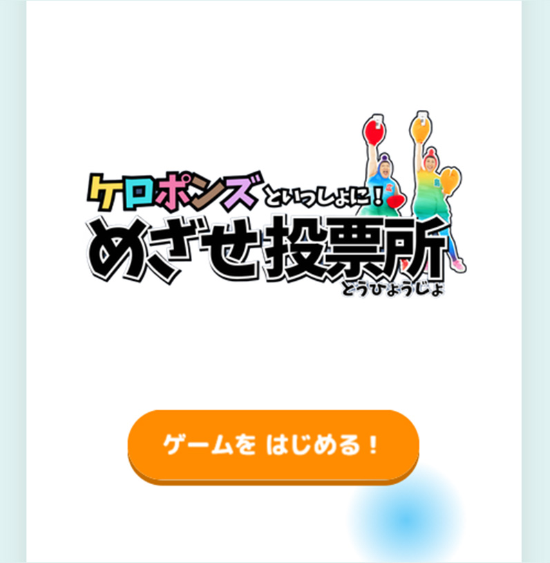 キャラクターを選(えら)び「この子(こ)といく!」をおすとクイズが表示(ひょうじ)されるので、ただしい答(こた)えを選(えら)んで、選(えら)んだキャラクターをとうひょうじょに到着(とうちゃく)させてあげてくださいね。クイズは3問(もん)だよ、がんばってチャレンジしよう!